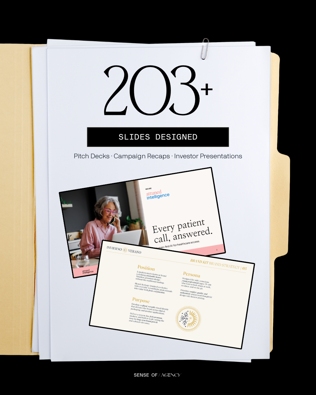 Behind many of those launches were moments of strategic storytelling built slide by slide. In 2025 alone, Sense of Agency designed more than two hundred and three slides across pitch decks, campaign recaps, and investor presentations. This work helped brands like Attuned Intelligence and Invierno & Verano clearly articulate their vision, value, and momentum to stakeholders, partners, and investors alike.