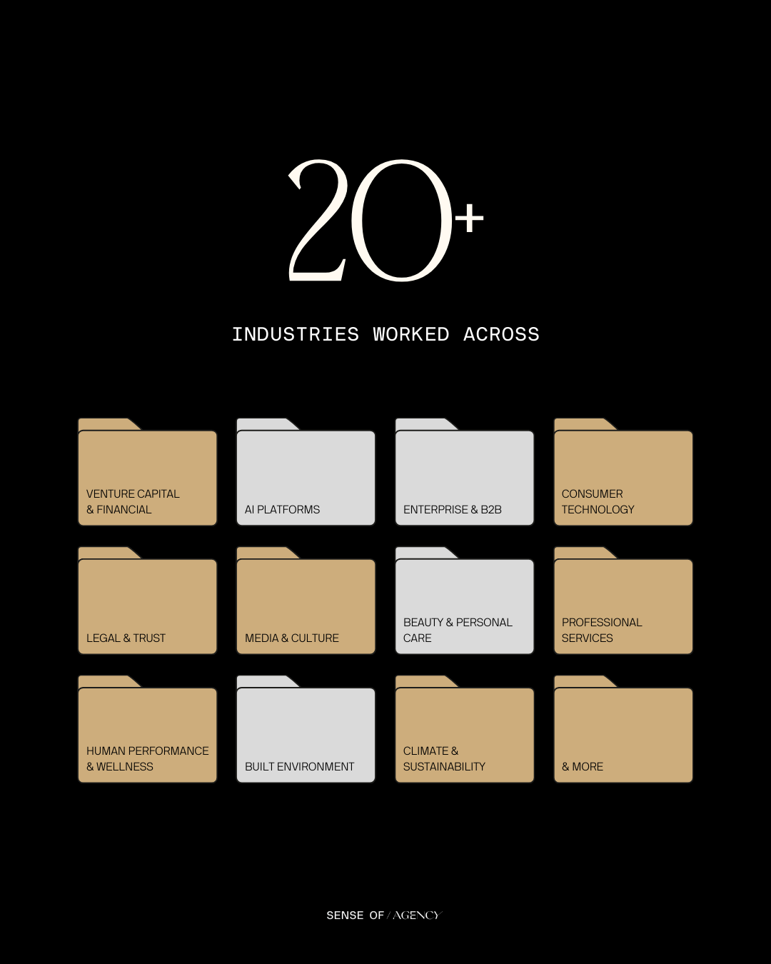 Throughout this past year, Sense of Agency worked across more than twenty industries, bringing thoughtful strategy and bold creative execution to a wide range of sectors. Our work spanned venture capital and financial services, AI platforms, enterprise and B2B organizations, consumer technology, legal and trust-based companies, media and culture brands, beauty and personal care, and climate and sustainability, just to name a few. Each industry required a distinct approach, and each partnership challenged us to adapt, refine, and expand how creativity could drive results.